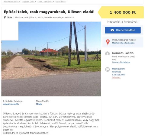 Egy hirdetési portál, a felhasználási feltételekre hivatkozva, több alkalommal is visszautasította a módosított hirdetést, melyben a fent említett és ismert ajánlat, a lehetséges vásárló állampolgárságára vonatkozó kitétele fordítottan jelent volna meg, azaz vásárlási szándékkal kizárólag magyar állampolgár élhetne, az izraeli állampolgárság kizáró ok. Az „izraeli” jelző ebben a kontextusban nem szerepelhetett, kizáró ok ezek szerint csak a magyarság lehet…