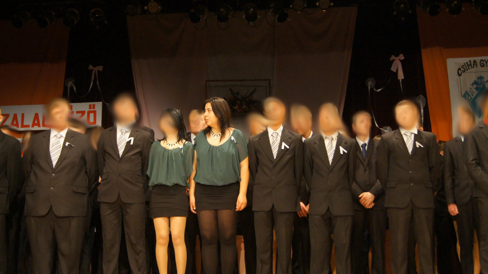 Elég megnézni a mostani szalagavató ünnepségen készült képet, ahol jól látszik, mennyire erkölcsös ez a "köztiszteletben álló" tanárnő. Rövidebb a miniszoknyája, mint a mellette álló tanítványáé... És részegen engedte fogdosni magát az ünnepség után.