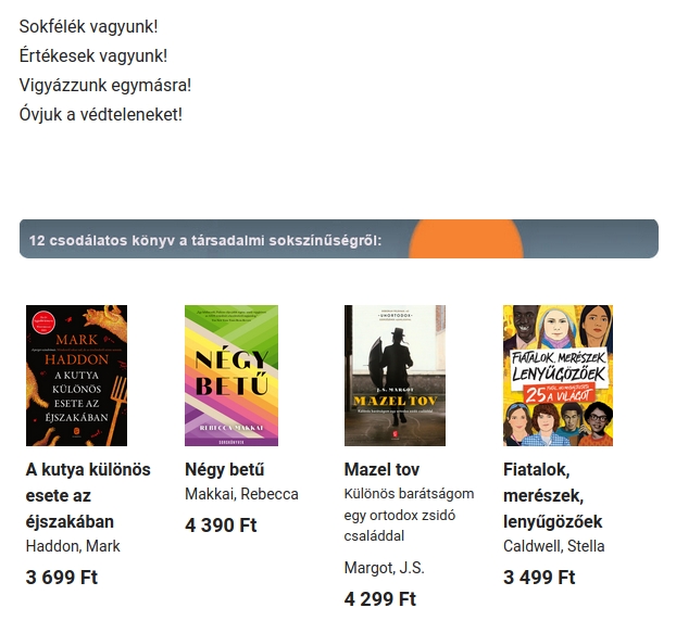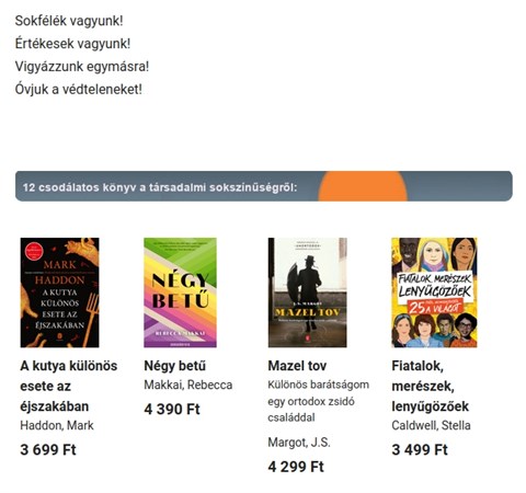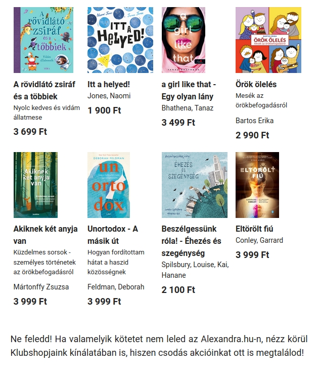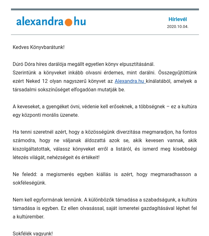 Olvasónk fiókjában (is) landolt a nagy nevű Alexandra könyvesbolt-hálózat tegnapi hírlevele a fentebbi jeligére, benne "12 csodálatos könyv a társadalmi sokszínűségről" és egy émelyítően progresszív ajánló. Hogy miként jönnek szerintük a zsidók és az örökbefogadás az aberráció propagandájához, azt csak sejtjük...