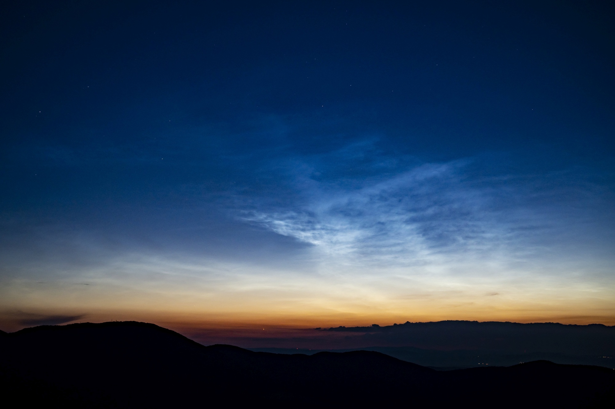 Éjszakai világító felhő (Noctilucent Cloud - NLC) Salgótarján közeléből fotózva 2021. július 4-én. A jelenséget a légkör nagy magasságú, 80-85 kilométeres rétegében lévő vízjég-kristályok okozzák, amelyek visszaverik a horizont alatt lévő Nap fényét.