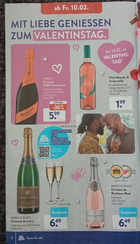 Február közepe van, közeleg a Valentin-nap, ez az esemény pedig minden évben szerepet kap a rovatban valamely progresszív reklám miatt. Ilyenkor a különböző ajándéktárgyak mellett gyakran akcióznak le alkoholos italokat is, ezt láthatjuk ezen az aldis szórólapon is.