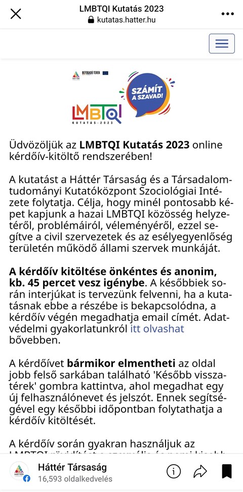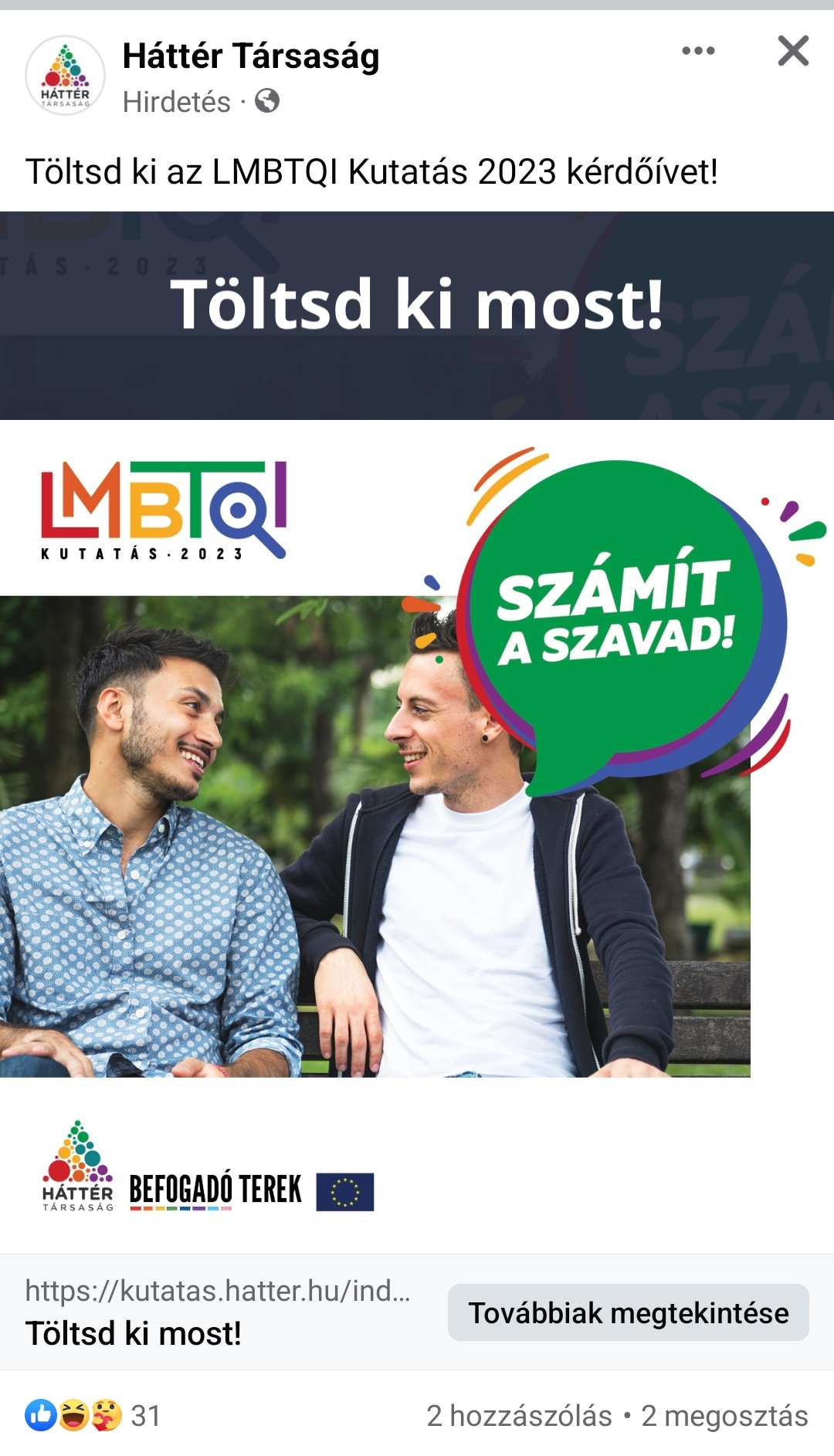 De van itt más is. A Facebook javasolta olvasónknak, hogy töltse ki a Háttér Társaság és a Társadalomtudományi Kutatóközpont Szociológiai Intézetének közös, 2023-as LMBTQI-kutatását.