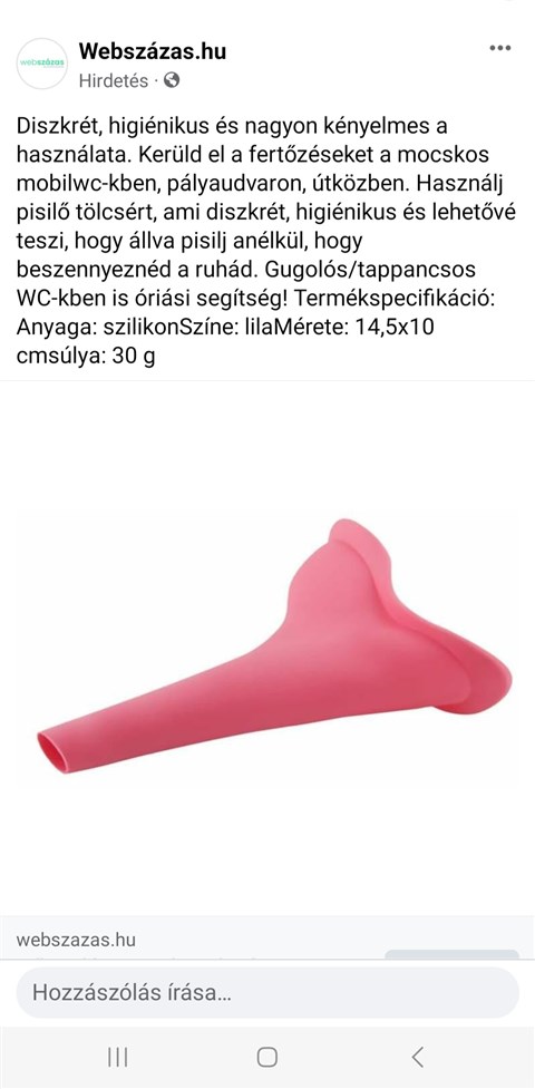 2. Ismét válogattam egyet "eltévedt" Facebook-hirdetésekből. Kedves férfi olvasónknak női szilikon vizelettölcsért ajánlott a hírfolyama. "Diszkrét, higiénikus, és nagyon kényelmes", illetve "a WC-kben is óriási segítség". Kihagyhatatlan ajánlat minden magyar férfi számára!