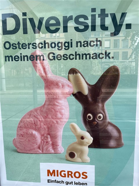 Cseppet sem tolakodó a német szövegben a jól kiemelt, "woke" körökben divatos angol "diversity" szó. És még mintha a nyulak között is lenne fajkeveredés... Persze ez minden más esetben megmosolyogtató riadalom lenne csokinyulak esetében, ezzel a felütéssel viszont alighanem ezt is szerették volna sugallni, és persze a mellüket verni a progressziójukat bizonyítandó.