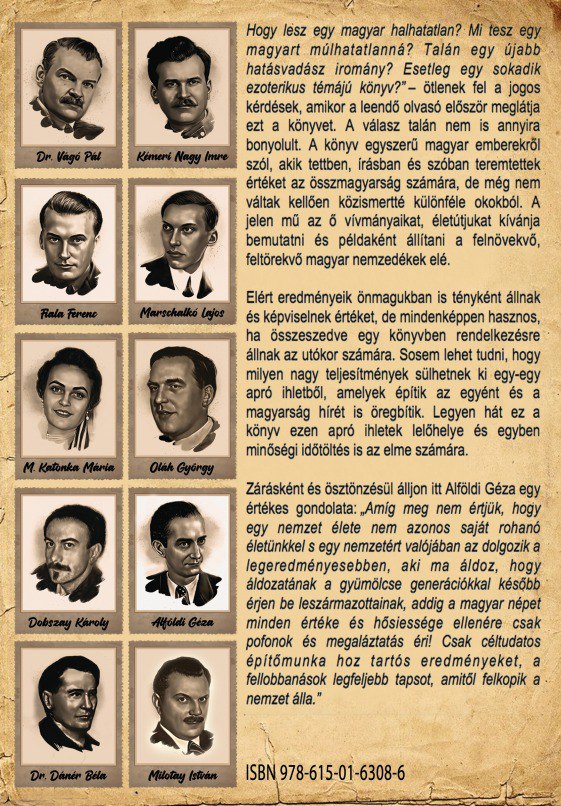 – A könyv valójában két rövidebb könyvkezdemény egyesített változata, így helyénvalóbb lenne 8 plusz 2 személyről beszélni összességében. Hisszük, hogy a magyarságnak, különösen mostanság, szüksége van valós teljesítményt elérő példaképekre, akikkel bármikor azonosulni tud bárki a saját emberi és esendő mivoltuk miatt, de példát is tud róluk venni, ha az Élet próbára teszi őket. És különben is, ha a kínaiaknak lehet nyolc halhatatlanja, akkor miért pont nekünk járna kevesebb? Különösen ha múlhatatlanok is járulnak ehhez – fogalmaz.