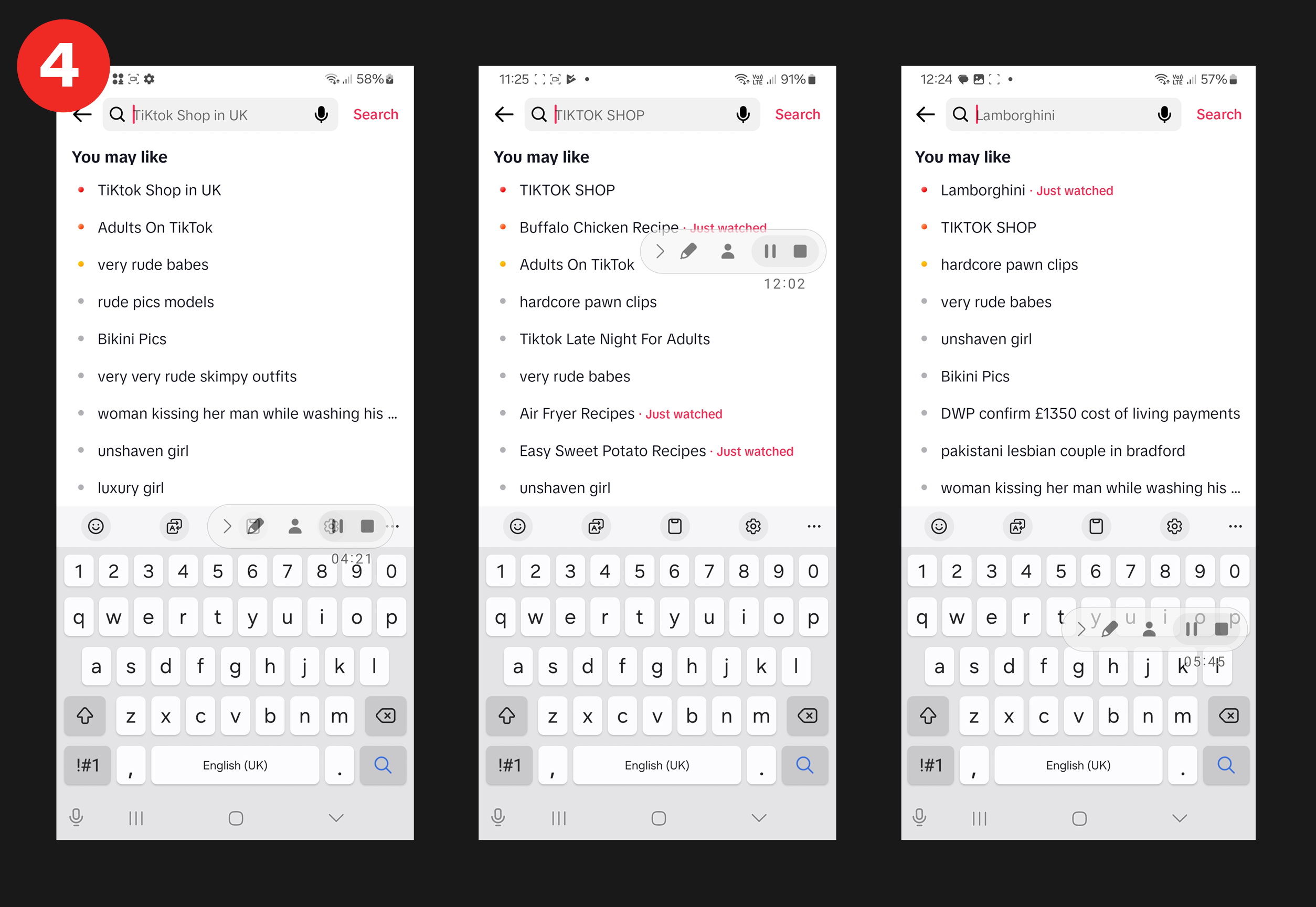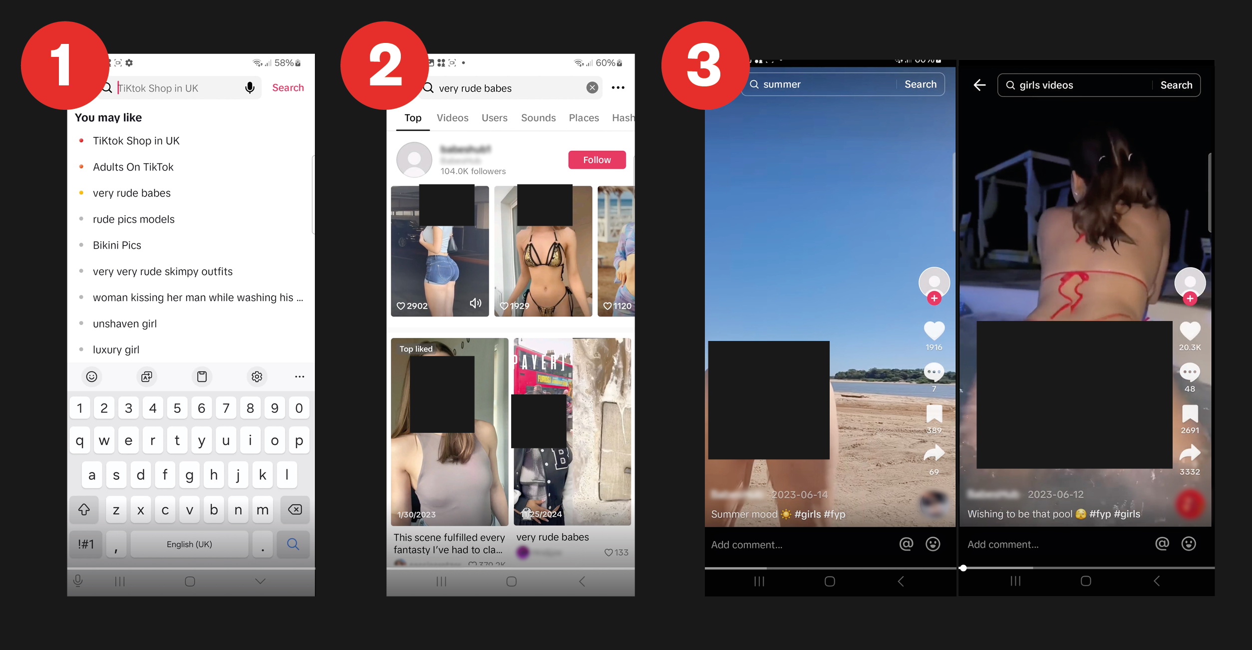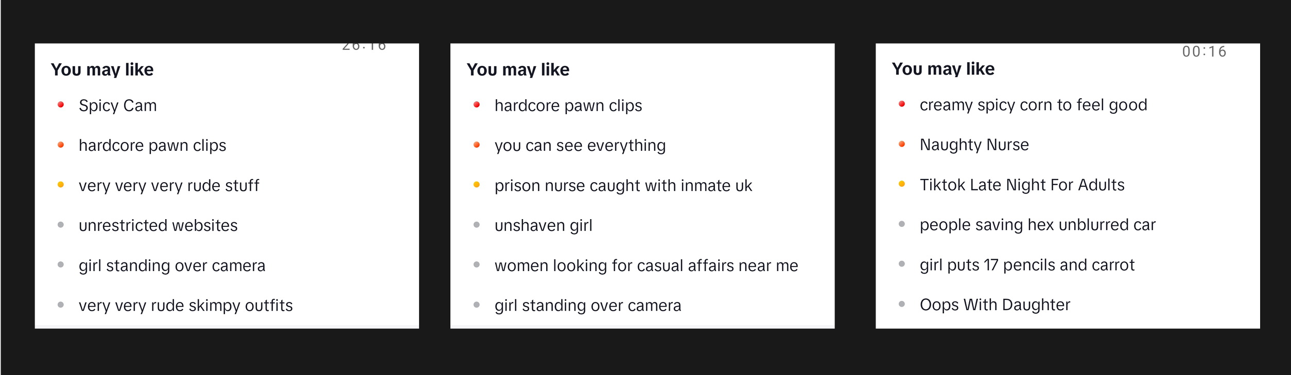 A TikTok algoritmusa pornográfiát és erősen szexuális tartalmú videókat ajánl a kiskorú felhasználóknak – írja a BBC a Global Witness emberi jogi csoport kutatása alapján. A kutatók hamis gyermekfiókokat hoztak létre a TikTokon, 13 évesnek beállítva magukat, és, bár aktiválták a platform gyerekeknek szánt biztonsági beállításait, ezek után is ömlöttek rájuk a szexuális tartalmak: a javasolt keresések szexuális tartalmú anyagokhoz vezették őket, amelyekben erőszak, valamint behatolásos szex volt látható.