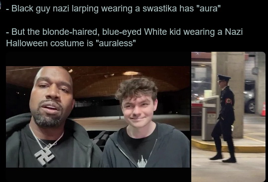 ![]() Egy nácit alakító, szvasztikát viselő fekete fickónak van „aurája”, de egy halloweenkor náci egyenruhát viselő szőke, kék szemű fehér kölyöknek nincs |