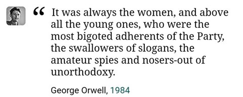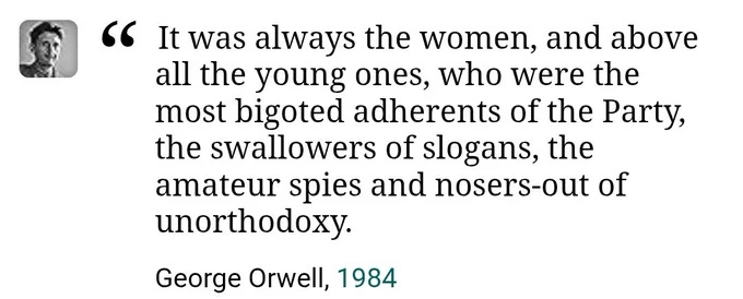 ![]() Mindig a nők és főleg a fiatalok voltak a párt legvakbuzgóbb hívei, a szólamok benyelői, a műkedvelő kémek és az eltérő vélemények kiszagolói |