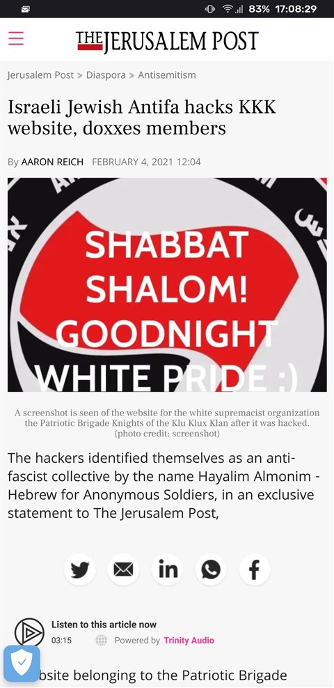![]() A „fehér büszkeség” annyira csípi az izraeli antifasiszták csőrét, hogy retorzióként meghekkelték a Ku-Klux-Klan egyik honlapját és közzétették a tagok személyes adatait |