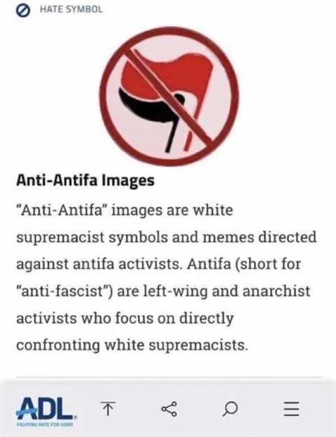 ![]() A zsidó szupremácista Rágalmazásellenes Liga (ADL) gyűlöletjelképnek és a „fehér felsőbbrendűség” megnyilvánulásának tartja az antifaellenes szimbólumokat |