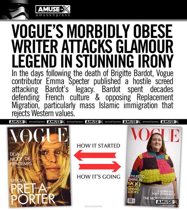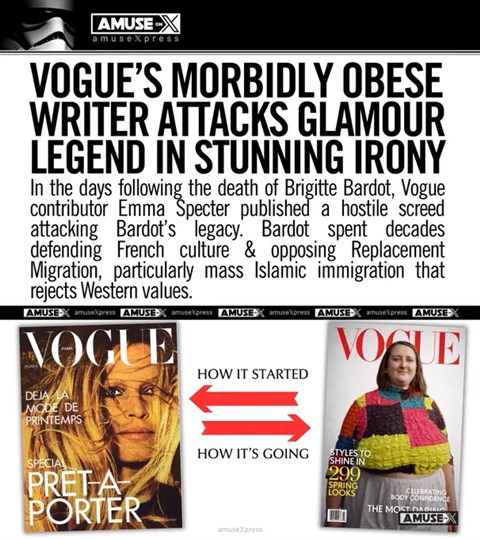Emma Specter, a magazin kulturális rovatának munkatársa képletesen megtépte Brigitte Bardot haját, amiért a 60-as évek szexszimbóluma a későbbi életében szélsőjobboldali politikusokat (Jean-Marie Le Pent) támogatott, lekicsinyelte a filmiparban szexuális bántalmazást elszenvedő nők MeToo mozgalmát, és felemelte szavát országa iszlamizálódása ellen.