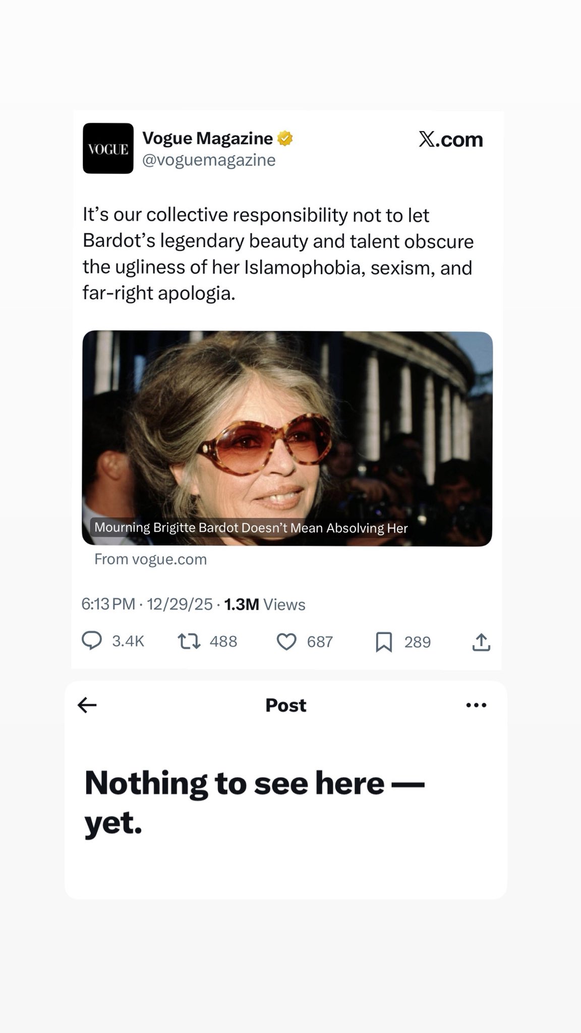 Ahelyett, hogy gyászunkat arra korlátoznánk, hogy nosztalgikusan régi fotókat nézegessünk a choucroute-frizurás és bikinis Bardot-ról, tegyük fel magunknak a nehéz kérdéseket arról, hogy Bardot a "tökéletes" fehér nő prototípusának megtestesítésével milyen módon támaszkodott a szisztematikus marginalizációra és nyílt rasszizmusra (amely problémák Franciaországban a mai napig fennállnak).