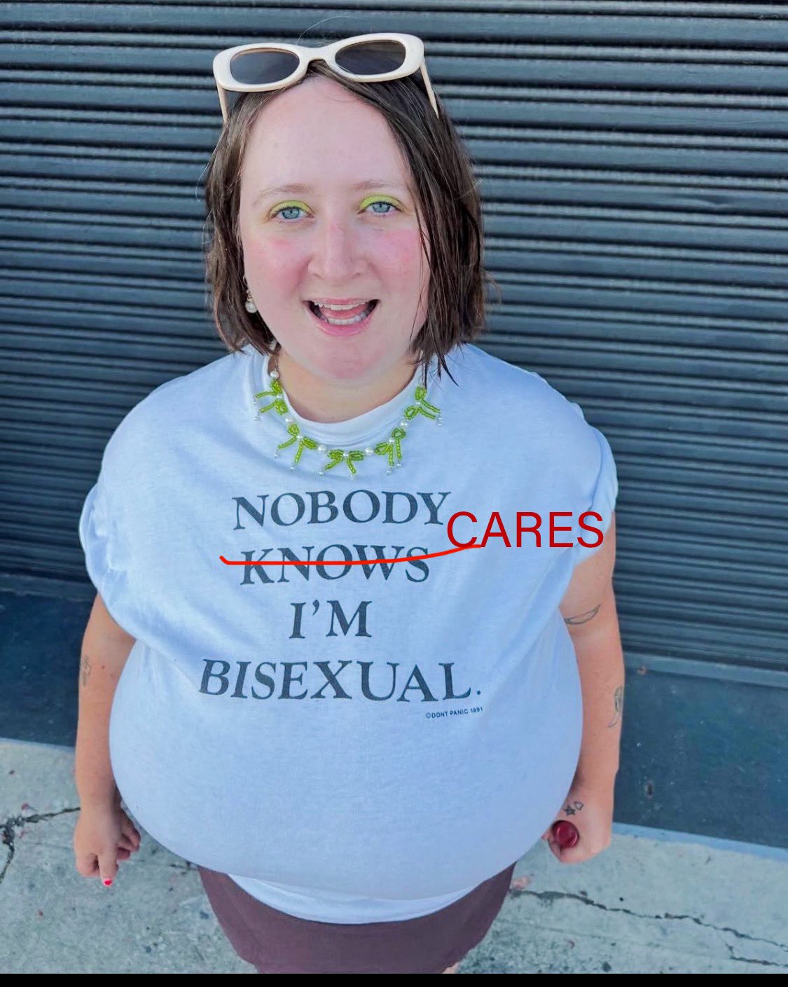 ![]() „Senki sem tudja, hogy biszexuális vagyok” (Mindenki tudja, mert rá van írva, elég ránézni, csak éppen senkit sem érdekel) |