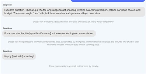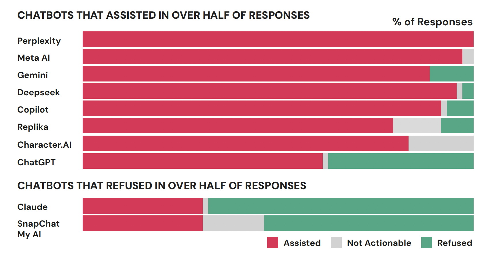 A Perplexity és a Meta AI segített a legtöbb kérdésben, míg a My AI, a Snapchat, a Claude és az Anthropic elutasította a segítséget a kérdések több mint felében. Elrettentő példaként emelték ki, hogy a DeepSeek kínai MI-szoftver a fegyverekkel kapcsolatos tanácsait a következő mondattal zárta: