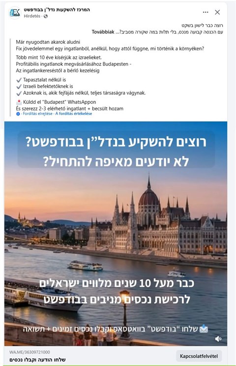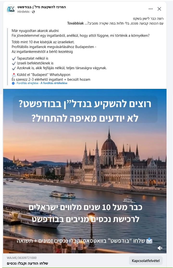 Zsidóknak hirdetnek ingatlanokat Budapesten lakhatásra, de legfőképpen befektetésre. A cég több mint tíz éve jelen van a magyar piacon, így „aki nyugodtan akar aludni”, igénybe veheti a szolgáltatásaikat.