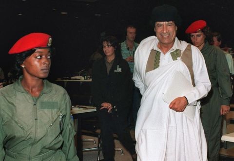 ![]() Muammár el-Kadáfi testőrnői kíséretében 1989-ben |