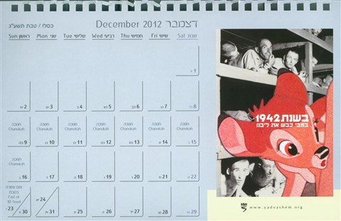 A Jád Vásém által kiadott naptár legérdekesebb illusztrációja azonban a még előttünk álló decembert, hanuka havát ékesíti: az eredetileg 1945-ben, Buchenwaldban készült fölvételen táborlakók fekszenek a priccsen. Az eredeti fényképen a saját állítása szerint rajta van Éli Wiesel is, de itt a naptár montázsképének készítői a híres Walt Disney-mesefigurával kitakarta a Nobel-békedíjast. A fotó közepére, a hasaló foglyok elé biggyesztett Bambi feje fölött ez olvasható: „1942-ben Bambi meghódította a szívünket.” (A Felix Salten regényéből készült Bambi című animációs filmet ugyanis abban az évben mutatták be Amerikában.)