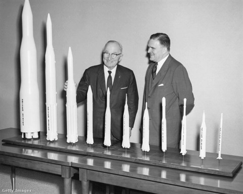 ![]() James E. Webb (jobb oldalon) rakétamodelleket mutat be Harry S. Truman amerikai elnöknek, 1961 novemberében (fotó: Smith Collection/Gado / Getty Images Hungary) |