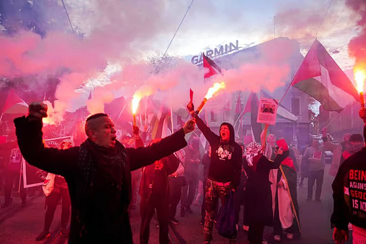 Oslo utcáin, és érkezett el a norvég parlament elé tiltakozva a mérkőzés megtartása ellen. A Gázai övezetben elkövetett népirtás miatt a tüntetők Izrael kizárását is követelték a nemzetközi versenyekről.