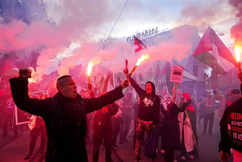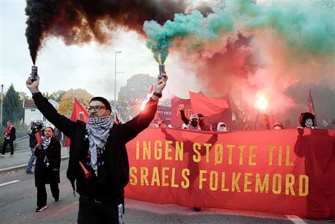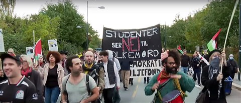 ![]() Tüntetők vonulnak Oslo utcáin. A fekete molinón norvégül ez olvasható: A diákok tiltakoznak a népirtás ellen (fotó: videókép) |