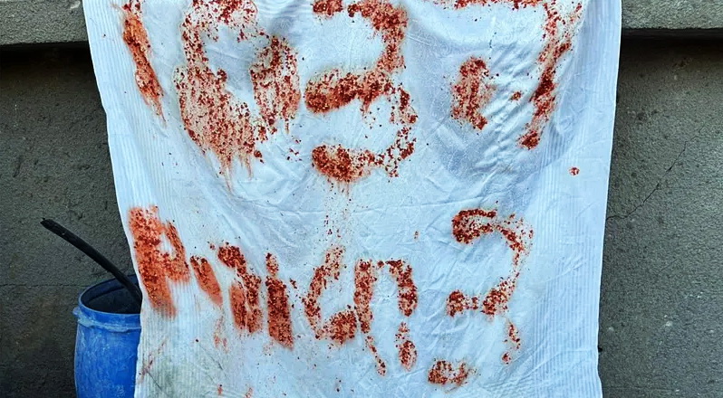 ![]() Az izraeli foglyok által lengetett, ételmaradékkal írt fehér zászló (fotó: izraeli hadsereg szóvivősége) |