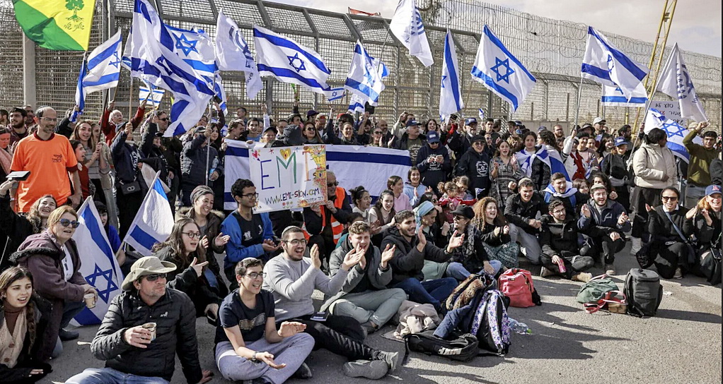 ![]() A „9-es behívóparancs” aktivistái a niccánai határátkelőnél megakadályozzák a segélyszállító kamionok belépését a Gázai övezetbe (fotó: AFP) |