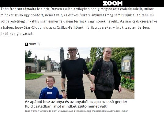 „Több fronton támadta le a brit Draven család a világban eddig megszokott családmodellt, mikor mindkét szülő úgy döntött, nemet vált, és ötéves fiúkat(sic!)/lányukat (meg sem tudjuk állapítani, mi volt eredetileg) inkább simán embernek, nem férfinak vagy nőnek nevelik. Az már csak cseresznye a habon, hogy Star-Cloudnak, azaz Csillag-Felhőnek hívják a gyereket – írtuk szeptemberben, önök pedig olvasták.”