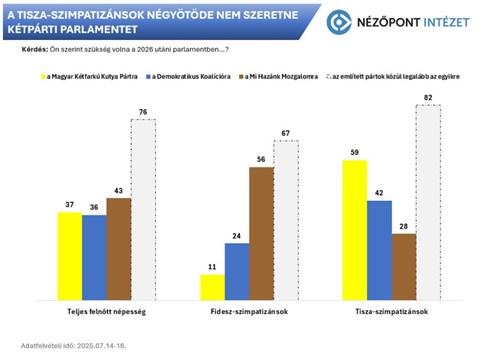 A Fidesz-közeli Nézőpont Intézet ezúttal arra volt kíváncsi, hogy a magyar szavazók szeretnének-e jövőre kétpárti parlamentet, amely a jelenlegi kormánypártot és a Tiszát foglalná magába. A dolog apropóját pedig az adta, hogy a baloldali ellenzék körében folyamatos egyeztetések, viták zajlanak arról, kell-e más baloldali erő a parlamentbe a Tiszán kívül.