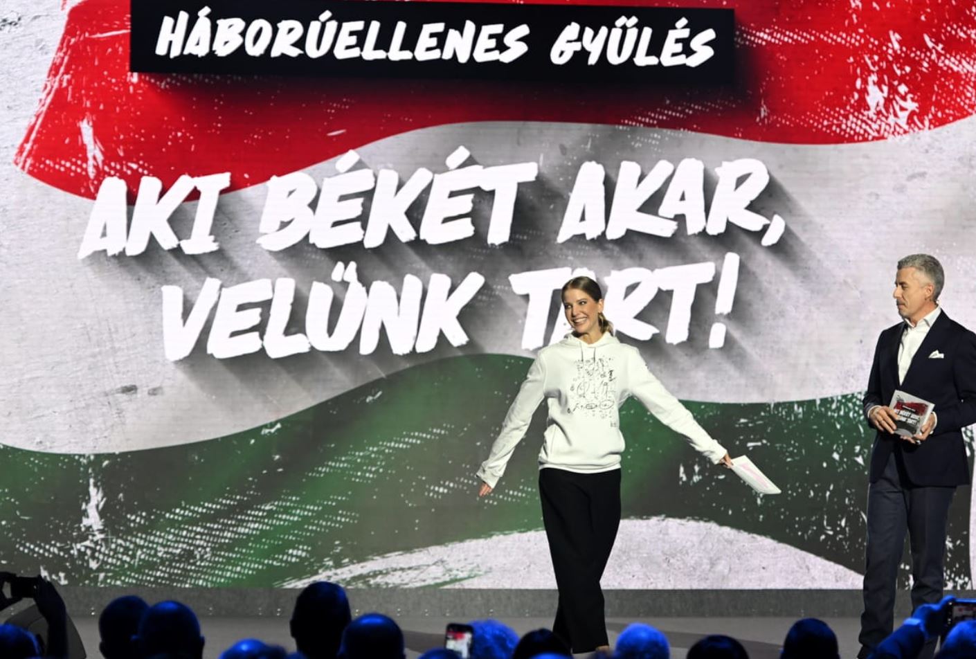 ![]() Szabó Zsófi a Fidesz "háborúellenes" győri DPK-gyűlésén, Orbán Viktor firkálmányával a testén 2025. november 15-én (fotó: hvg) |