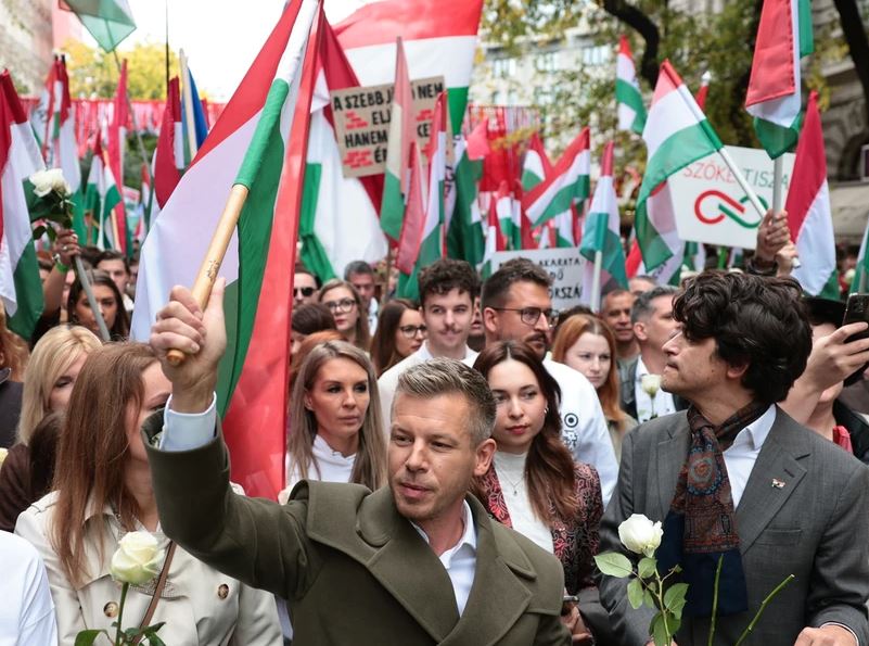 ![]() Magyar Péterék nemzeti színekbe burkolózva, minden jellegzetes karaktert nélkülöző szürke technokratákkal vágnak neki a választásoknak (fotó: Czerki Gábor/Blikk) |