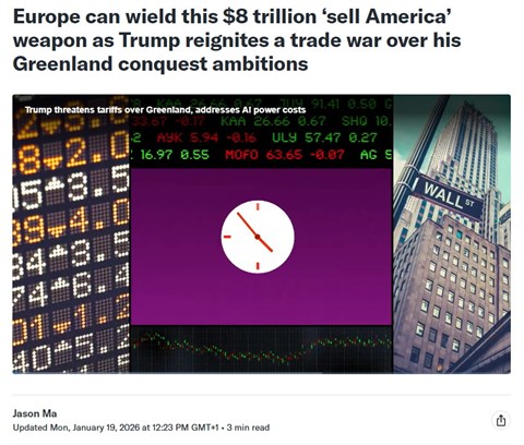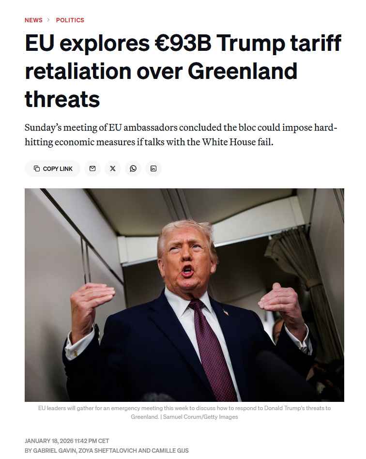 Trumpot valójában teljesen váratlanul érte az európaiak heves reakciója Grönland annektálására tett fenyegetéseire. Miután évtizedekig tetszhalottnak tűnt, Európa hirtelen visszanyerte túlélési ösztönét, és brutálisan belemászott az amerikai gólem pónemébe. Mivel a vámmegállapodása összeomlóban volt, Trump közvetlen gazdasági háborút kockáztatott az EU-val, és más sem hiányzott volna a teljesen legatyásodott és csak folyamatos tőzsdemanipulációval felszínen tartott amerikai gazdaságnak.
