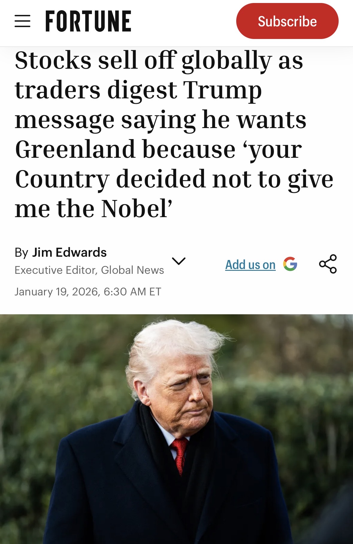 ![]() Világszerte esett a tőzsdeindex, miután Trump azt mondta, hogy azért akarja Grönlandot, mert „az országotok úgy döntött, hogy nem nekem adja a Nobel-díjat” |