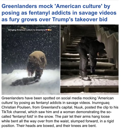 ![]() Egy grönlandi pár az „amerikai kultúrán” gúnyolódik, drogfüggő amerikaiak jellegzetes pózát utánozva |