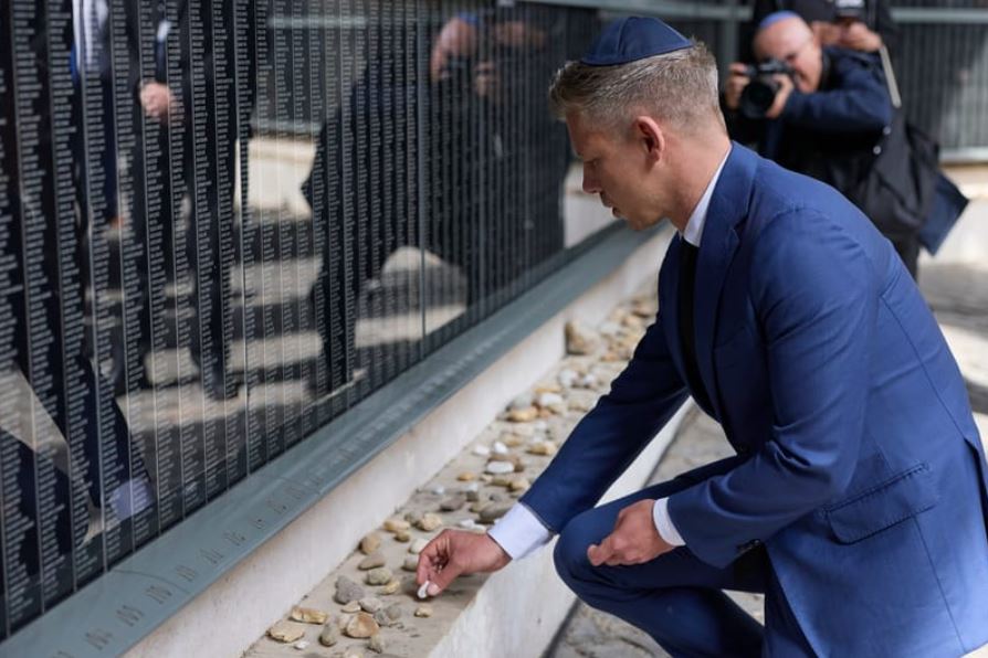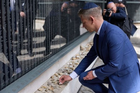 ![]() A Holokauszt Dokumentációs Központ és Emlékgyűjtemény Páva utcai épületénél lévő emlékfalnál Magyar Péter kavicsot helyez el 2026. április 16-án (fotó: Ritter Doron/Mazsihisz) |