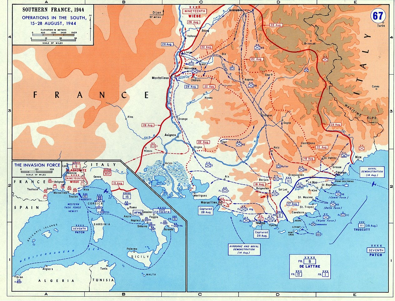 Egy partraszállási kísérlet Dramont-tól északnyugatra a német ütegek tüzelése következtében kudarcot vallott. Cannes és Nizza vidékén a parti szakaszok sok pontján súlyos harcok folynak. A német erők mindenütt helyükön voltak, és már az első órák megmutatták, hogy ez újabb angolszász partraszállási vállalkozás méreteiben sokkal kisebb, mint a június 6-i normandiai partraszállás volt. A német parti ütegek zárótüzében meg lehetett figyelni, hogy az angol–amerikai szállító hajóhad több egységén tűz támadt. Több szállítóhajó elsüllyedt. Az eddig érkezett jelentések szerint az ellenségnek a St. Tropez-öbölben sikerült páncélos erőket is partra tenni. A harcok folynak.