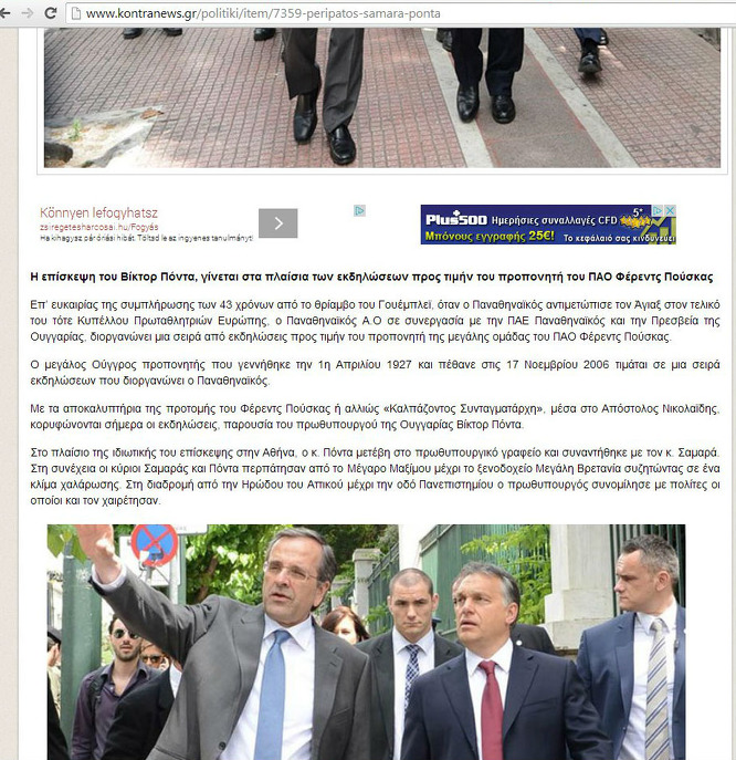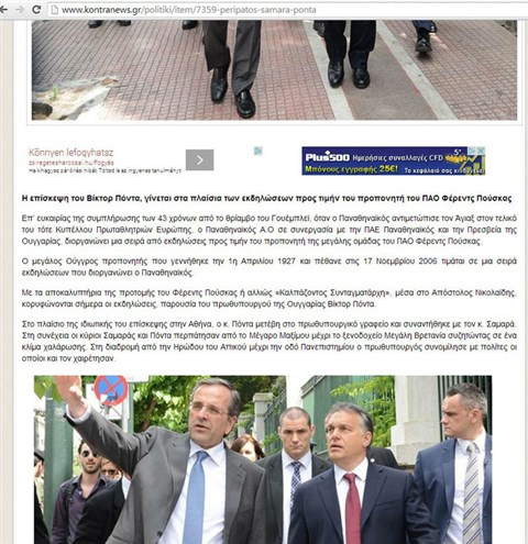 ![]() "Victor Ponta látogatása része a Puskás Ferenc egykori Panathinaikosz-edzőt méltató eseménysorozatnak" - olvasható görögül a cikk első sorában |
