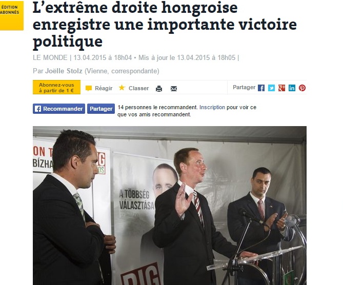 A magyar szélsőjobboldal jelentős politikai győzelmet könyvel el című tudósításában a francia balliberális Le Monde szerint a Jobbik győzelme "fájdalmas vereség a kormányzó konzervatív jobboldal számára és figyelmeztetés az egész Európai Uniónak".