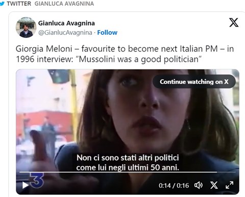Right-wing commentators say there is no evidence that Meloni thinks that Mussolini was a good politician who did everything he did for Italy. So here she is, in her own words. In French she says “I l think Mussolini was a good politician who did everything he did for Italy.” pic.twitter.com/KTIGU6eE4L— Ben Phillips (@benphillips76) September 26, 2022