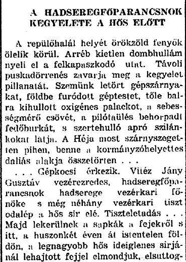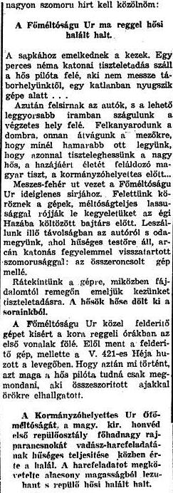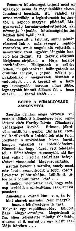 Szomorú kötelességet teljesít most az újságíró: néma és megilletődött tiszteletadással búcsúzik, itt, valahol az orosz mezőkön, a legkedvesebb bajtárstól, a legjobb magyar pilótától, Magyarország kormányzóhelyettesétől, aki névnapja hajnalán kötelességteljesítés közben hősi halált halt.