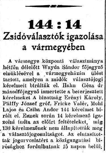 A vármegye központi választmánya hétfőn délelőtt Wayda Sándor főjegyző elnöklésével a vármegyeházán ülést tartott, amelyen a zsidók választójogi kérelmeit bírálták el. Hahn Géza dr. másodfőjegyző ismertette a beterjesztett kérelmeket. A bizottság Erényi Károly, Pálffy József gróf, Fricke Valér, Mohi Lajos és Csiba Andor 144 kérelmet bírált el. Ennek során 14 kérelmező igazolni tudta az előírt feltételeket, míg 130 kérelmezőnek nem állapították meg a választó jogosultságot. Az elutasítottak jogorvoslatért a közigazgatási bírósághoz fordulhatnak 15 napon belül.