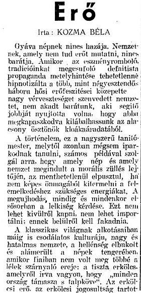 Gyáva népnek nincs hazája. Nemzetnek, amely nem tud erőt mutatni, nincs barátja. Amikor az eszményromboló, tradícióinkat megcsúfoló defaitista propaganda mételyhintése tehetetlenné hipnotizálta a több mint négyesztendős háború hősi erőfeszítései közepette nagy vérveszteséget szenvedett nemzetet, nem akadt barátunk, aki segítő jobbját nyújtotta volna, hogy abba megkapaszkodva kilábalhassunk az alacsony ösztönök kloákaáradatából.