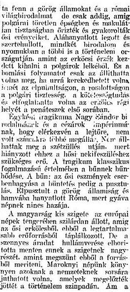 A klasszikus világnak alkotásaiban máig is csodálatos kultúrájú, nagy és hatalmas nemzete, a hellénség elbukott és alámerült a népek tengerében, amikor fiaiban nem volt meg többé a lélek szárnyaló ereje: a tiszta erkölcs, amelyről írva vagyon, hogy „minden ország támasza s talpköve”. Az erkölcsi erő, az erkölcsi jogosultság tartotta fenn a görög államokat és a római világbirodalmat, de csak addig, amíg polgárai töretlen épségben és makulátlan tisztaságban őrizték és gyakorolták ősi erényeiket. Aláhanyatlott legott és szertehullott, mindkét birodalom és nyomukban a többi is a történelem országútján, amint az erkölcsi érzék kezdett kihalni a polgárok lelkéből. És a bomlási folyamatot csak az állíthatta volna meg, ha úrrá kerekedhetett volna ismét az elpuhultságon, a romlottságon a polgári tisztesség, a kötelességtudás és elfoglalhatta volna az erkölcs régi helyét a penáteszek első sorában.