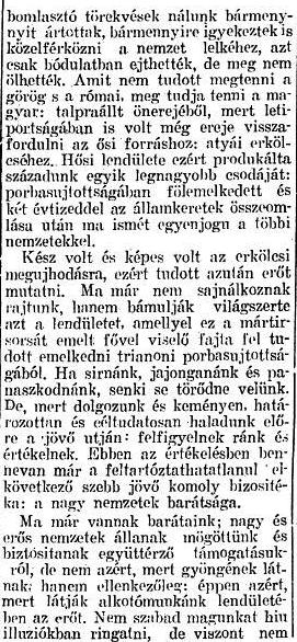 Kész volt és képes volt az erkölcsi megújhodásra, ezért tudott azután erőt mutatni. Ma már nem sajnálkoznak rajtunk, hanem bámulják világszerte azt a lendületet, amellyel ez a mártírsorsát emelt fővel viselő fajta fel tudott emelkedni trianoni porbasújtottságából. Ha sírnánk, jajonganánk és panaszkodnánk, senki se törődne velünk. De, mert dolgozunk és keményen, határozottan és céltudatosan haladunk előre a jövő útján, felfigyelnek ránk és értékelnek. Ebben az értékelésben benne van már a feltartóztathatatlanul elkövetkező szebb jövő komoly biztosítéka: a nagy nemzetek barátsága.