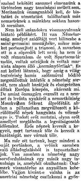 Nem kell századokra visszanyúlnunk biztató példákért Itt van Németország, amelyet az idő tájt vert bilincsbe a saint-germaini muszájbéke, mikor minket porbasújtott a trianoni. A zavarban ott is a söpredék lett úrrá; ha nem is volt rémuralom, de volt Spartacus-lázadás, voltak sztrájkok és voltak marxista alapon álló „kormányférfiak”. És azt kellett látnunk, hogy amíg a világ testvériség hamis szólamával bódító megszállottak intézték a németség sorsát, nem akadt barátjuk és elszigetelten álltak Európa közepén, akárcsak mi. De amint önmagára eszmélt ez a nemzet és lerázta nyakáról a nemzetköziség Moszkvában felkent álprófétáit, abban a pillanatban megváltozott a körülötte élő népek hangulata és véleménye is. Tudott erőt mutatni, olyan erőt, amellyel meglábolta a legválságosabb időszakot. Erős népnek keresik a kegyeit, mert tartanak tőle és keresik a barátságát, mert várnak tőle.