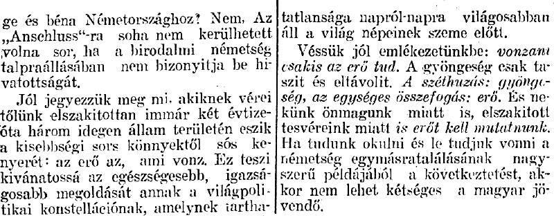 Véssük jól emlékezetünkbe: vonzani csakis az erő tud. A gyöngeség csak taszít és eltávolít. A széthúzás: gyöngeség, az egységes összefogás: erő. És nekünk önmagunk miatt is, elszakított testvéreink miatt is erőt kell mutatnunk. Ha tudunk okulni és le tudjuk vonni a németség egymásra találásának nagyszerű példájából a következtetést, akkor nem lehet kétséges a magyar jövendő.