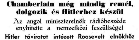 Excellenciád szeptember 26-án az amerikai nép nevében táviratban felhívott, hogy a béke fönntartása érdekében tegyek meg mindent, és a kérdéseket békés és becsületes rendezéssel oldjuk meg. Legyen meggyőződve excellenciád arról, hogy a legnagyobb mértékben méltányolom azt a nemes szándékot, ami önt e kijelentésében vezette és a magam részéről mindent elkövetek, hogy elkerülhető legyen az európai háború, amely beláthatatlan következményekkel járhat. Éppen ezért el kell hárítanom minden felelősséget a német népről, ha az események mégis ellenségeskedés kitöréséhez vezetnének. A német nép 1918-ban bízott abban, hogy ellenfelei a békeszerződések megvalósításában úgy járnak el, ahogy kell. Alávalóbb módon még nem játszották ki egy nép bizalmát, mint ez a német nép esetében történt. A Párizs-környéki békeszerződések az adott ígéretekből semmit sem váltottak be.