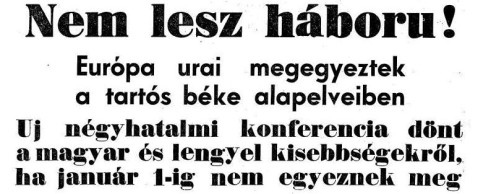 A brit világbirodalom miniszterelnökének az utolsó szavai a békéről szólottak. Megmondotta, hogy a békéért fog dolgozni az utolsó pillanatig. Kérdezzük azonban, milyen békéért? Vannak békék, amelyek elfogadhatók s amelyek elfogadhatatlanok. Még mindig hinni akarjuk, hogy Chamberlain erőfeszítései az elfogadható békének szólnak. Olyan békének, amely Németországot, Magyarországot és Lengyelországot egyaránt kielégíti. Várunk csendben és törhetetlen fenntartással és elszántan a Felvidékre vonatkozó igényeinkért. Reméljük, hogy ezek az igények békés úton nyernek kielégülést. De ha nem így lenne, akkor a magyar nép tudni fogja kötelességét.