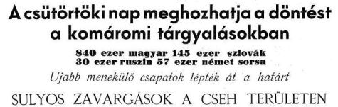 Komárom, október 12. MTI. A magyar küldöttség tagjai szerdán délben gépkocsin hajtattak át Ókomáromba a vármegyeházán a cseh delegációval folytatandó tárgyalásokra. Útközben a lakosság meg-megújuló lelkesedéssel üdvözölte a magyar küldöttség tagjait.