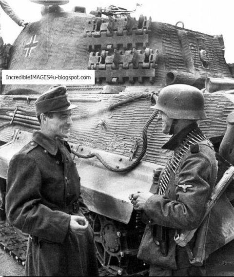 ![]() Magyar és SS-katona cigarettázik 1944 decemberében. Háttérben Tigris-2 harckocsi |