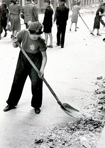 ![]() Sárgacsillagos nő romeltakarításon |